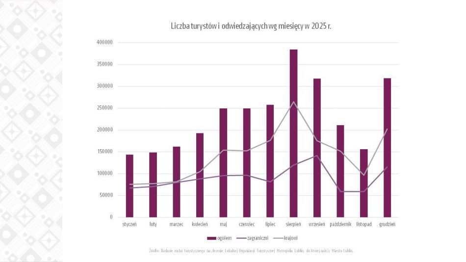 Padł kolejny rekord pod względem liczby turystów odwiedzających Lublin. Według zgromadzonych danych w 2025 r. miasto odwiedziło ponad 2,2 mln osób, co oznacza 15% wzrost w porównaniu z rokiem poprzednim. 77% wszystkich gości stanowili przyjezdni krajowi, wśród których najliczniejszą grupę stanowili mieszkańcy województwa mazowieckiego. Lublin staje się coraz popularniejszym kierunkiem także wśród turystów zagranicznych, m.in. z Wielkiej Brytanii, USA czy Włoch.