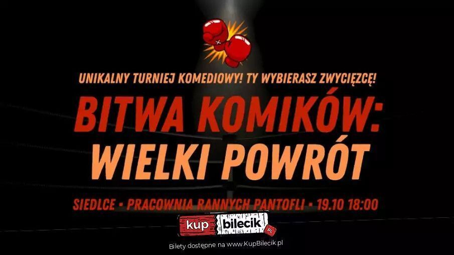 Bitwa Komików to format fascynujący, który przypadł do gustu publiczności jeszcze parę lat temu, dzięki czemu wielokrotnie wypełnialiśmy sceny komediowe aż po brzegi! Bitwy Komików odbywały się w takich miejscowościach jak Siedlce, Kraków, Legionowo, Lublin, Poznań, Gdańsk oraz Białystok! Wystąpią sami świetni profesjonalni doświadczeni komicy - partnerzy Stand-up No Limits oraz uczestników show Kanału Komediowego. Komicy będą odkrywani stopniowo, ale obiecujemy, że będą to istne tuzy komedii!