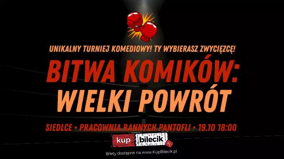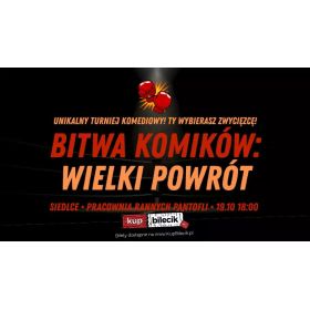 | Nowy sezon Bitwy Komików!dodano 2026-03-11 11:14:13 Legendarne show komediowe Bitwa Komików z nowym sezonem w Lublinie! Już 12.04 o 17:30 w Just Crafted. Bitwa Komików to format fascynujący, który przypadł do gustu publiczności jeszcze parę lat temu, dzięki czemu wielokrotnie wypełnialiśmy sceny komediowe aż po brzegi! Bitwy Komików odbywały się w takich miejscowościach jak Siedlce, Kraków, Legionowo, Lublin, Poznań, Gdańsk oraz Białystok! Wystąpią sami świetni profesjonalni doświadczeni komicy - partnerzy Stand-up No Limits oraz uczestników show Kanału Komediowego. Komicy będą odkrywani stopniowo, ale obiecujemy, że będą to istne tuzy komedii! Stand-up Bitwa komików: Wielki Powrót artyści: Komicy i stand-uperzyBitwa Komików to format fascynujący, który przypadł do gustu siedleckiej publiczności jeszcze parę lat temu, dzięki czemu pięciokrotnie wypełnialiśmy kultowe "pantofle" aż po brzegi! Bitwy Komików odbywały się także w takich miejscowościach jak Kraków, Lublin, Poznań oraz Białystok! Bilety do nabycia na: KupBilecik.pl |